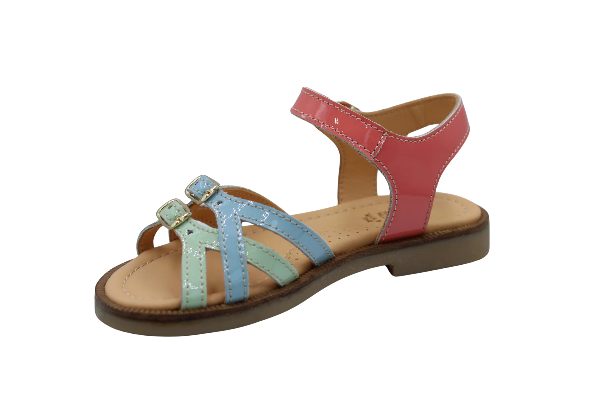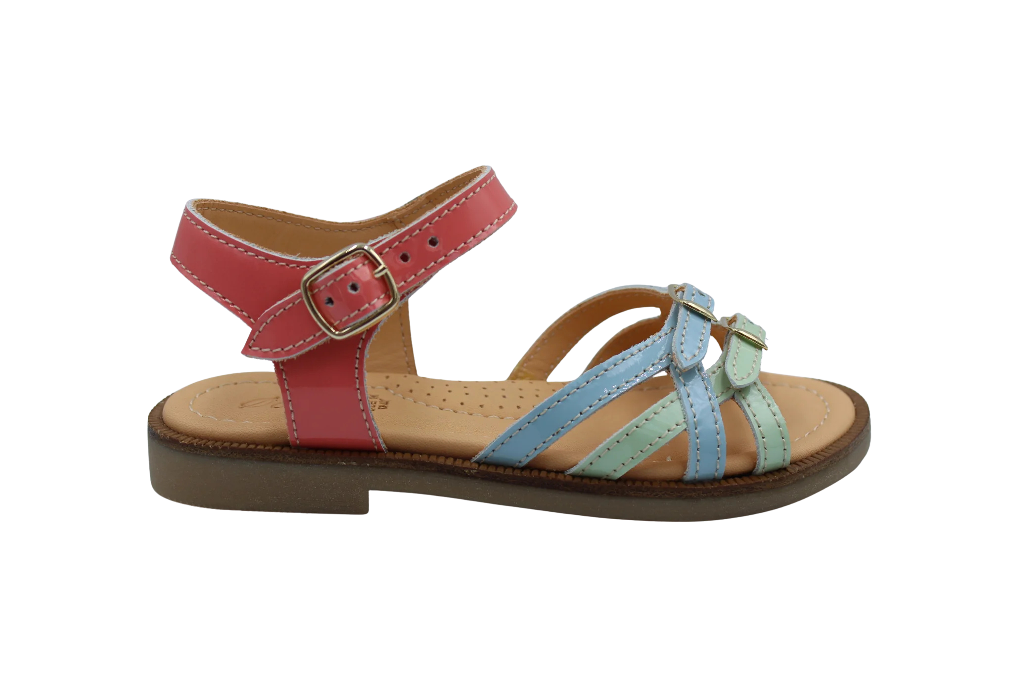 Een elegant sandaaltje in roze, blauw en muntgroen lakleer in fijne gevlochten bandjes. Ze zijn voorzien van een gesp aan de enkel en vooraan dus aanpasbaar aan elk voetje. De stevige en supercomfortabele zool zijn een vaste waarde bij Ocra.