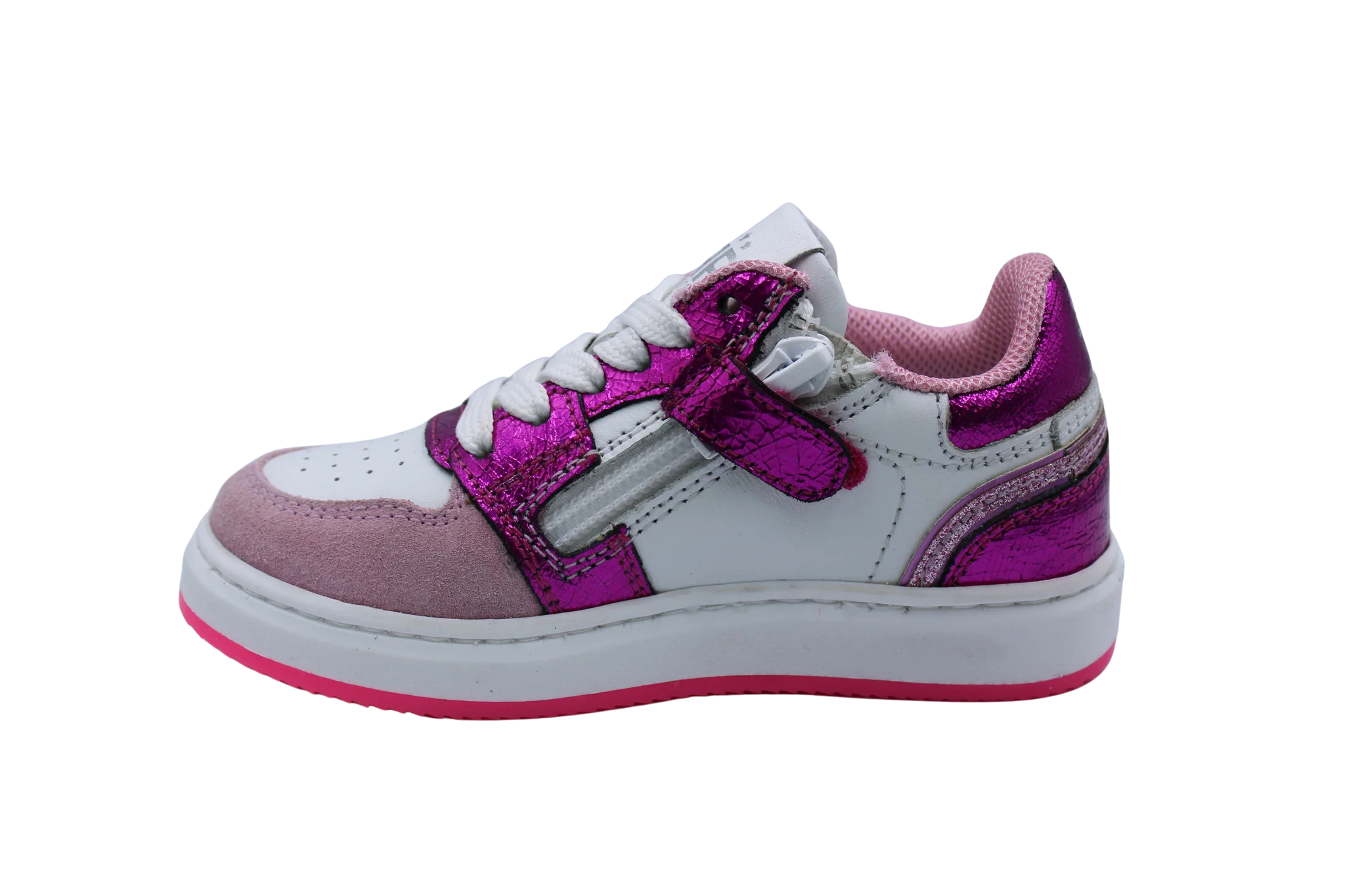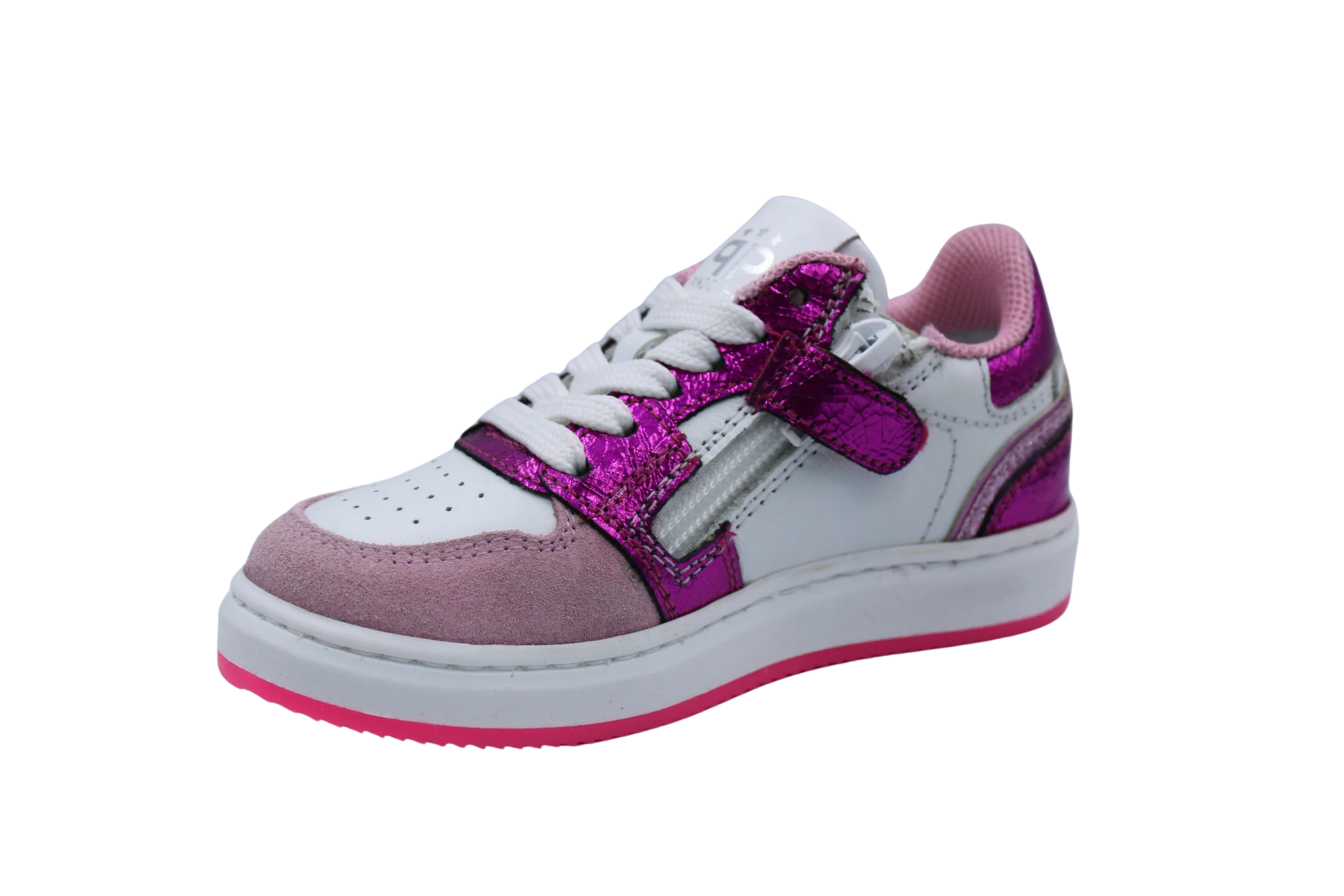 Witte lederen sneakers met accenten in roze nubuck fucsia metallic leer. Ze zijn voorzien van een verhoogd en uitneembaar lederen voetbed en rits opzij om makkelijk aan en uit te doen.
