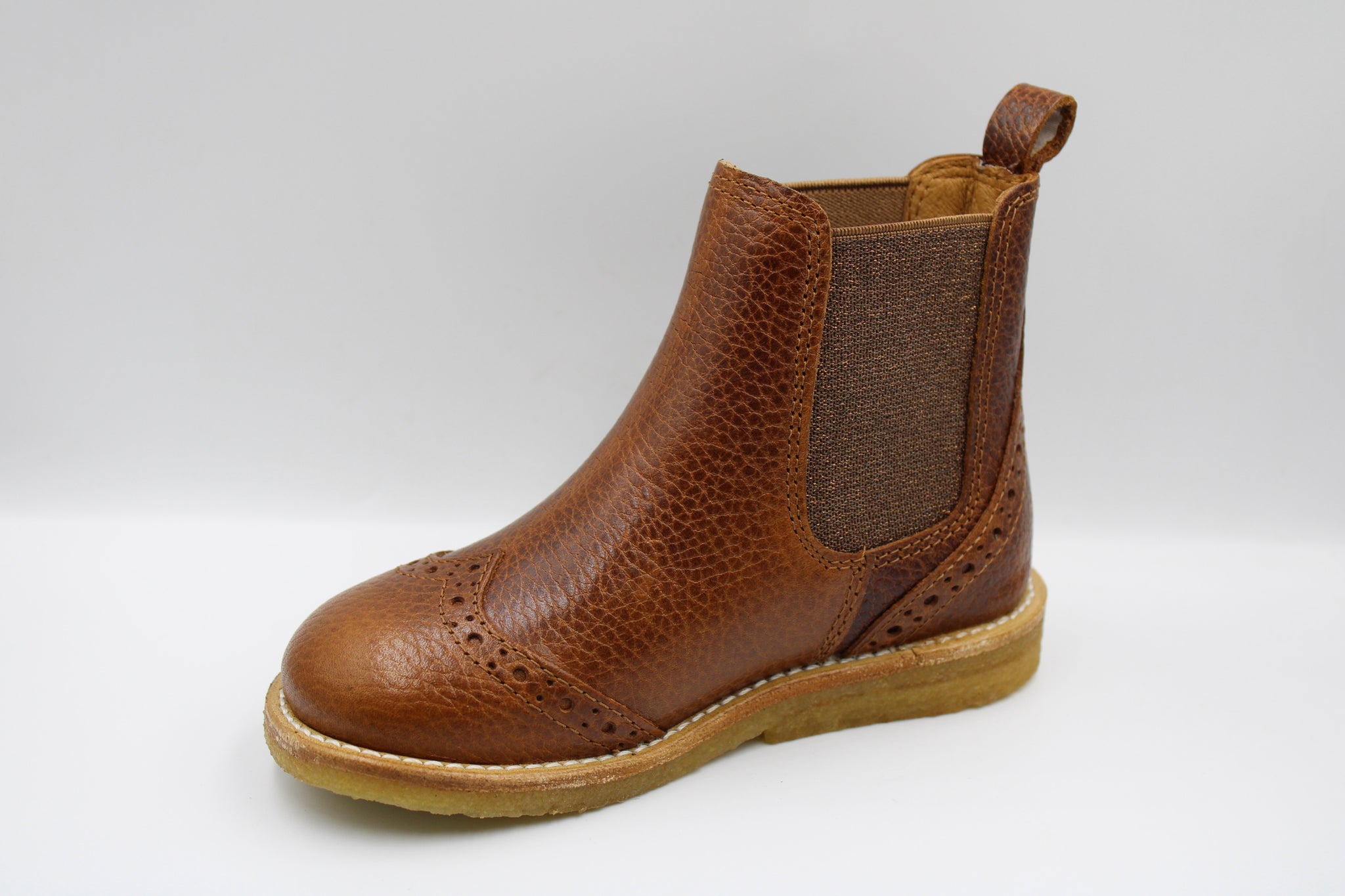 Prachtige chelsea laarzen in cognac leer met brogue details en bruine glitterrekkers. Geen rits dus wordt gewoon aangetrokken, hetgeen van deze laarsjes een ideale schoolschoen maakt. Met een stevige crêpe zool.