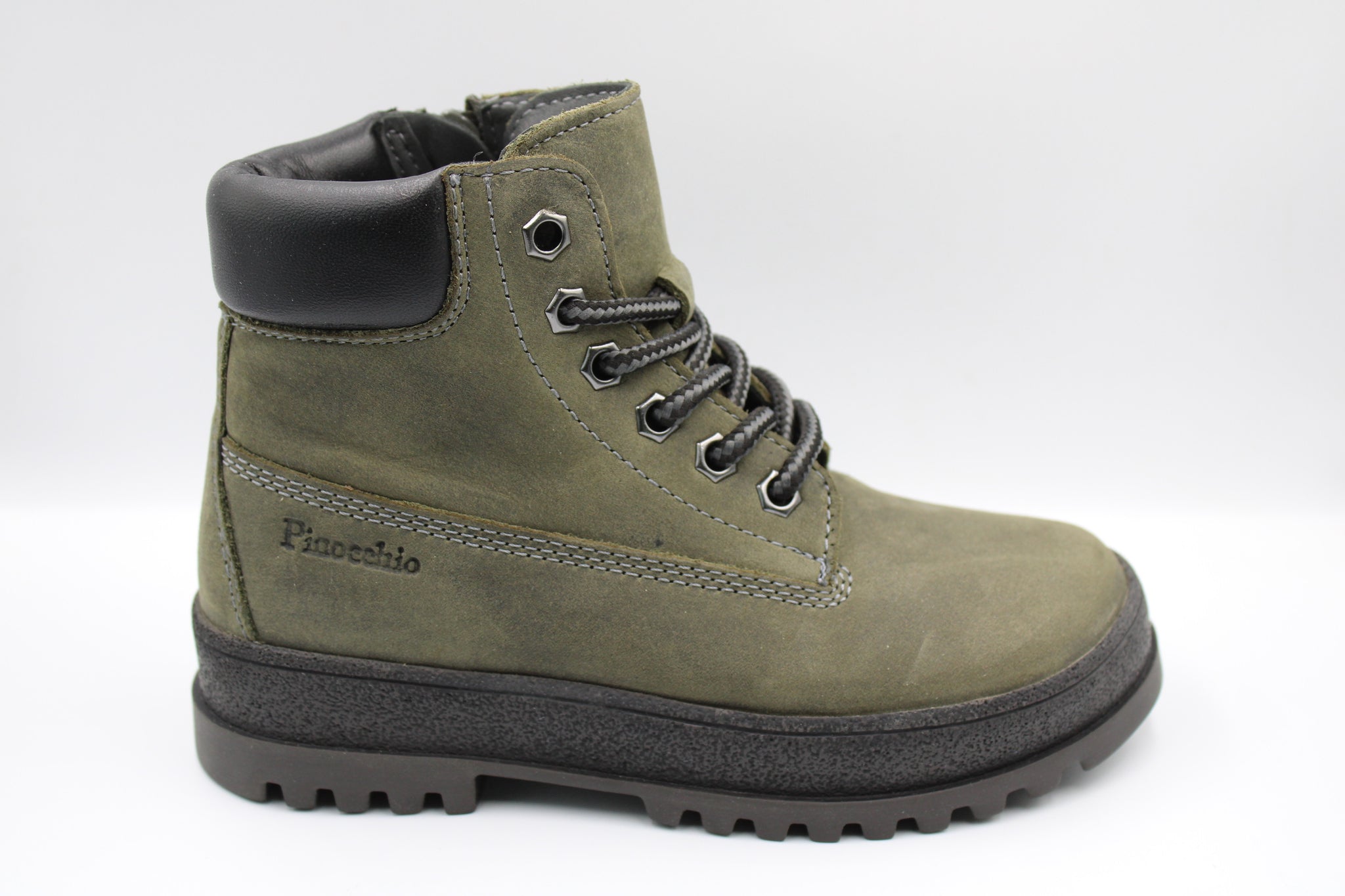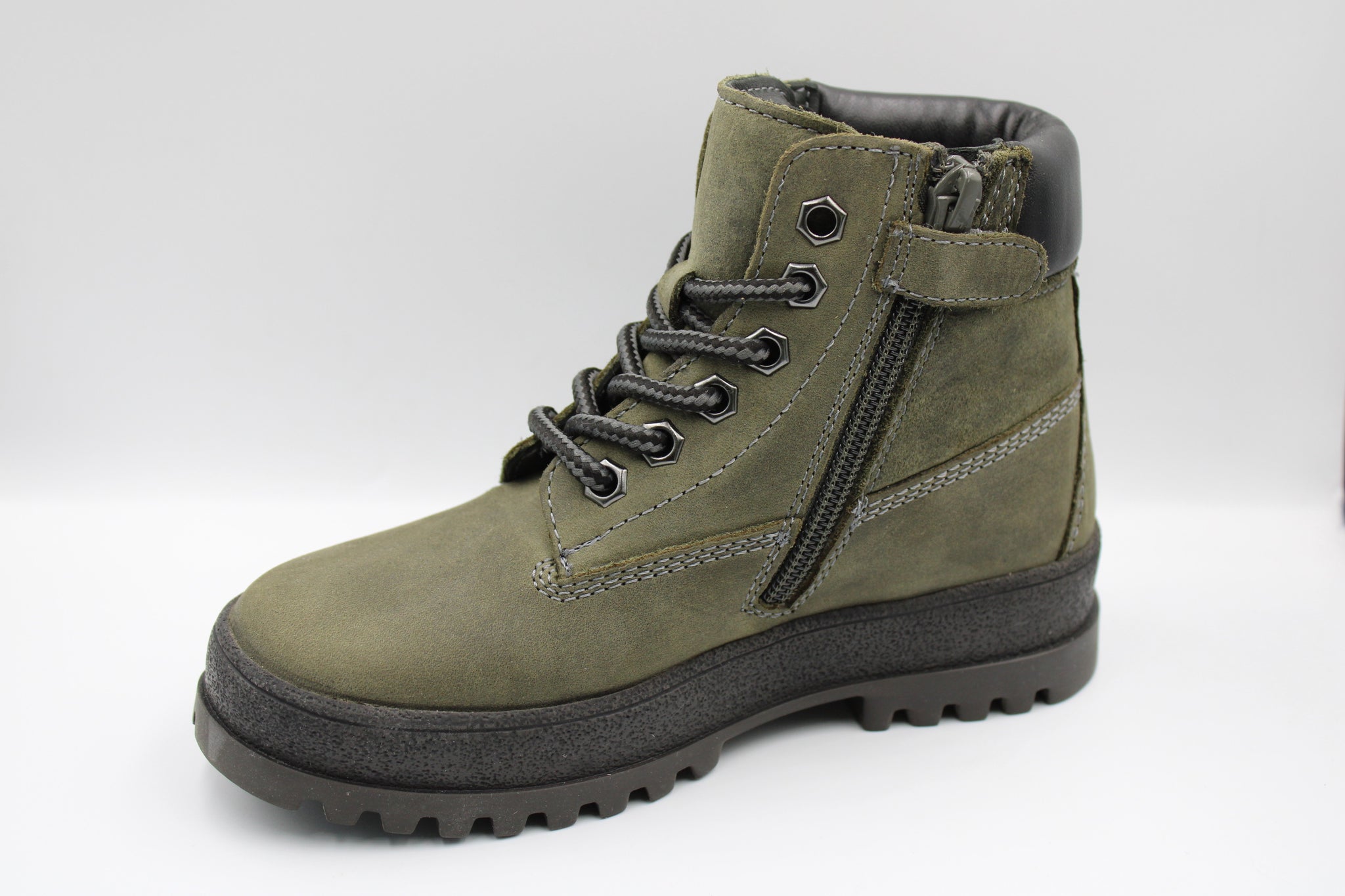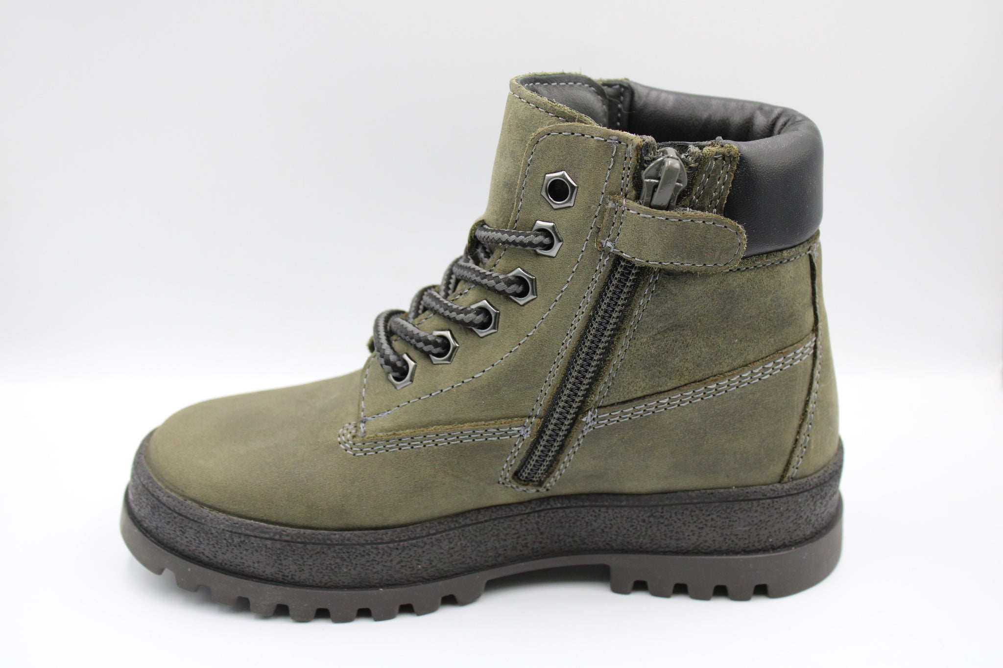 Een stevige bottine in grijsgroen nubuck met zwart lederen accent achteraan. Ze zijn voorzien van een verhoogd en uitneembaar lederen voetbed en rits opzij om makkelijk aan en uit te doen en stevige rubberen zool die werkelijk tegen alles kan en extra beschermt aangezien het rubber wat op de schoen doorloopt.