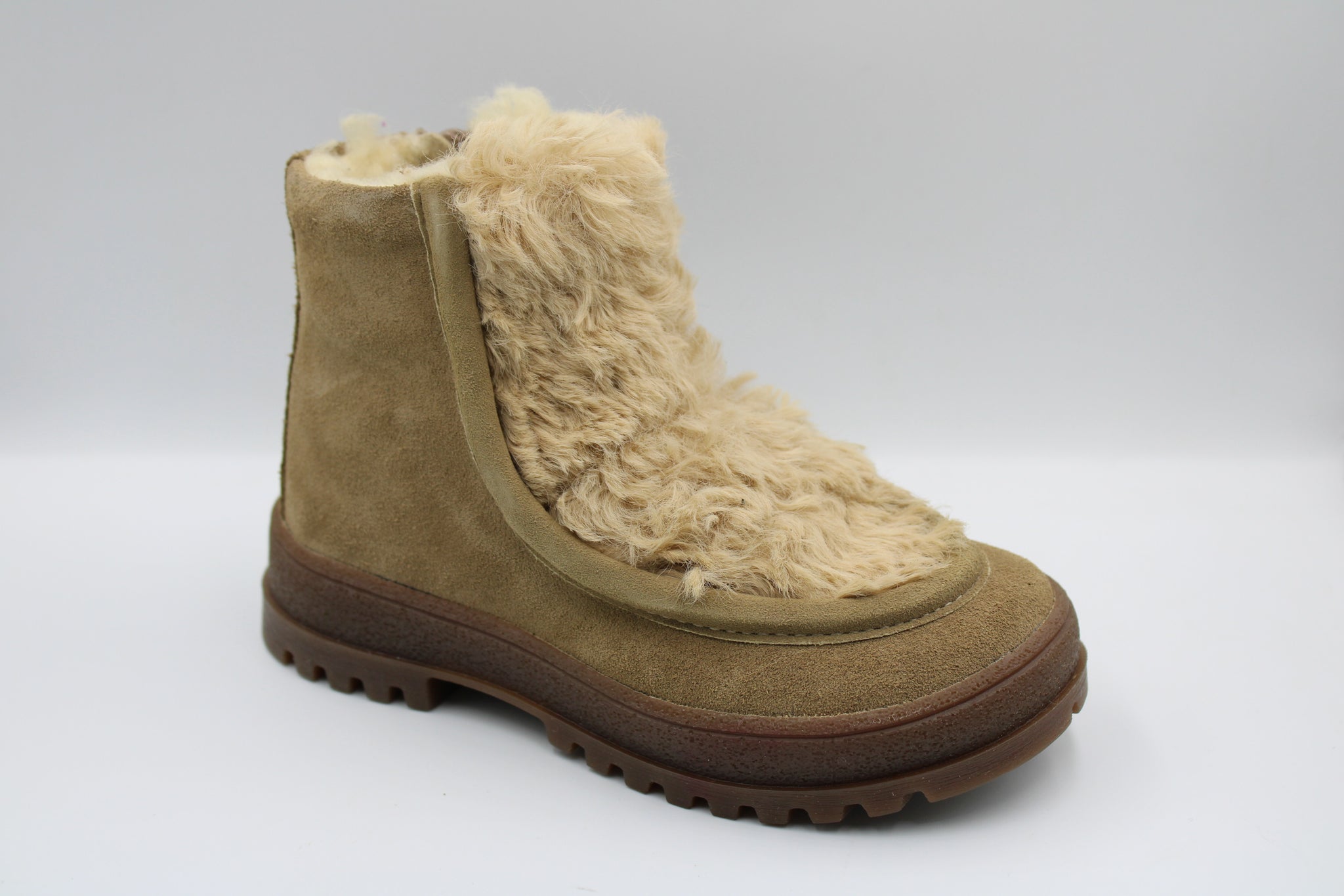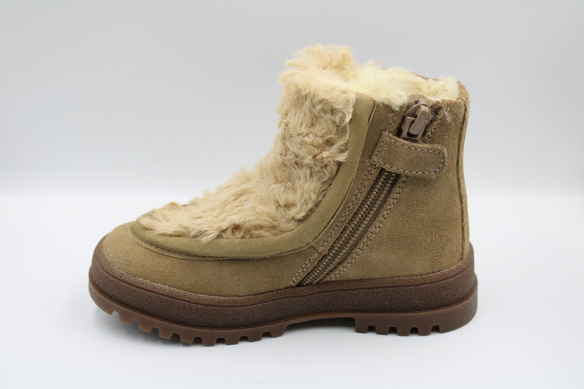 Schattige laarsjes in taupe nubuck met beige wolletje vooraan en gewatteerd binnenin voor extra warme voetjes. Ze zijn voorzien van een rits opzij om makkelijk aan en uit te doen en stevige rubberen zool die werkelijk tegen alles kan.