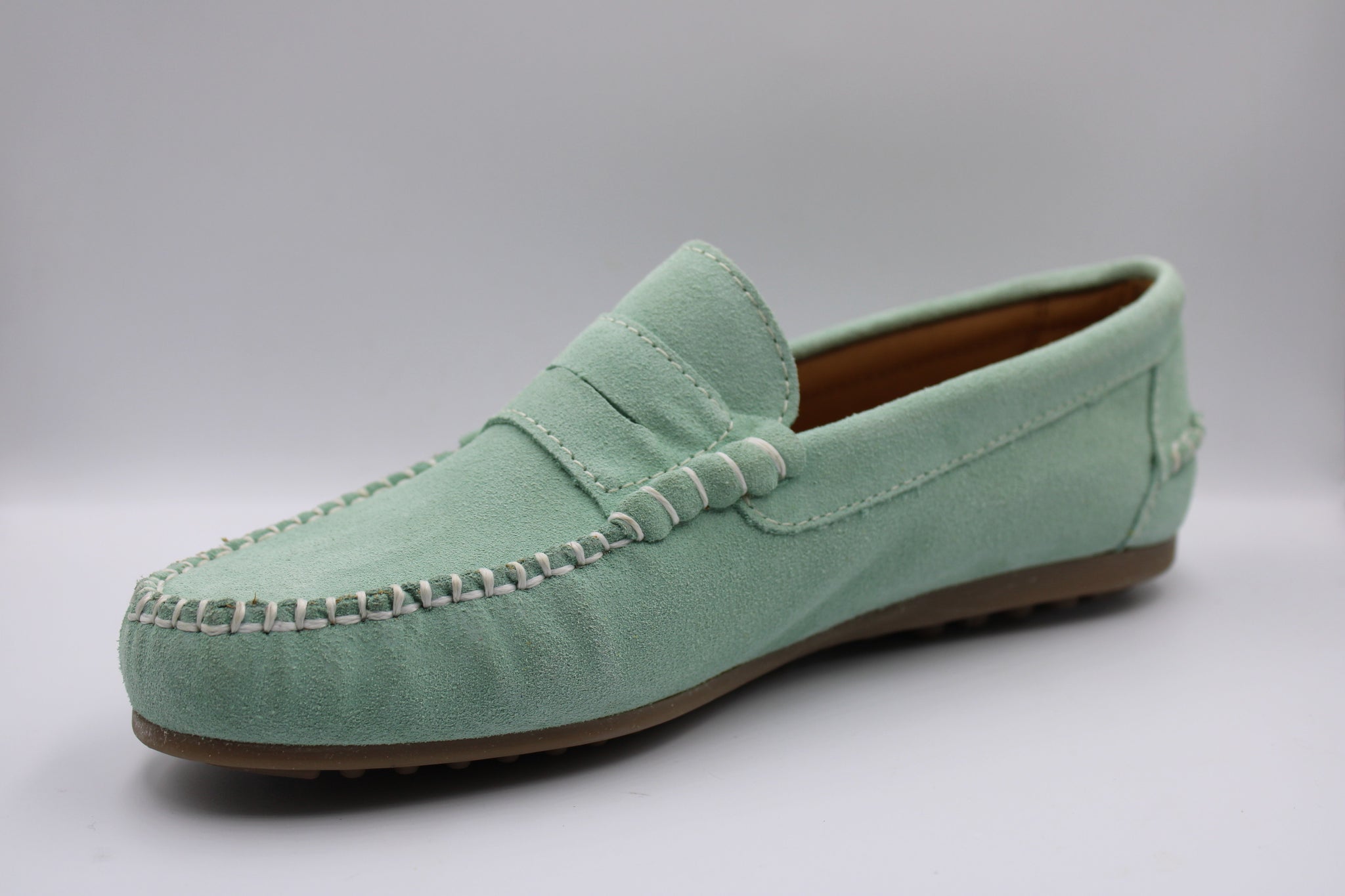 Een supercomfortabele loafer in muntblauw nubuck en accent op de wreef. Ze zijn voorzien van een stevige rubberen zool met noppen en lederen voetbed.