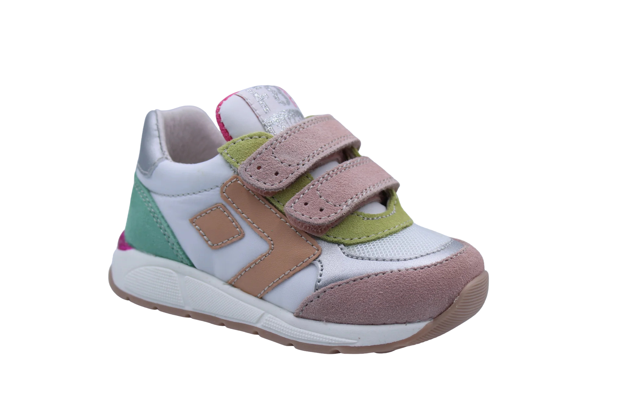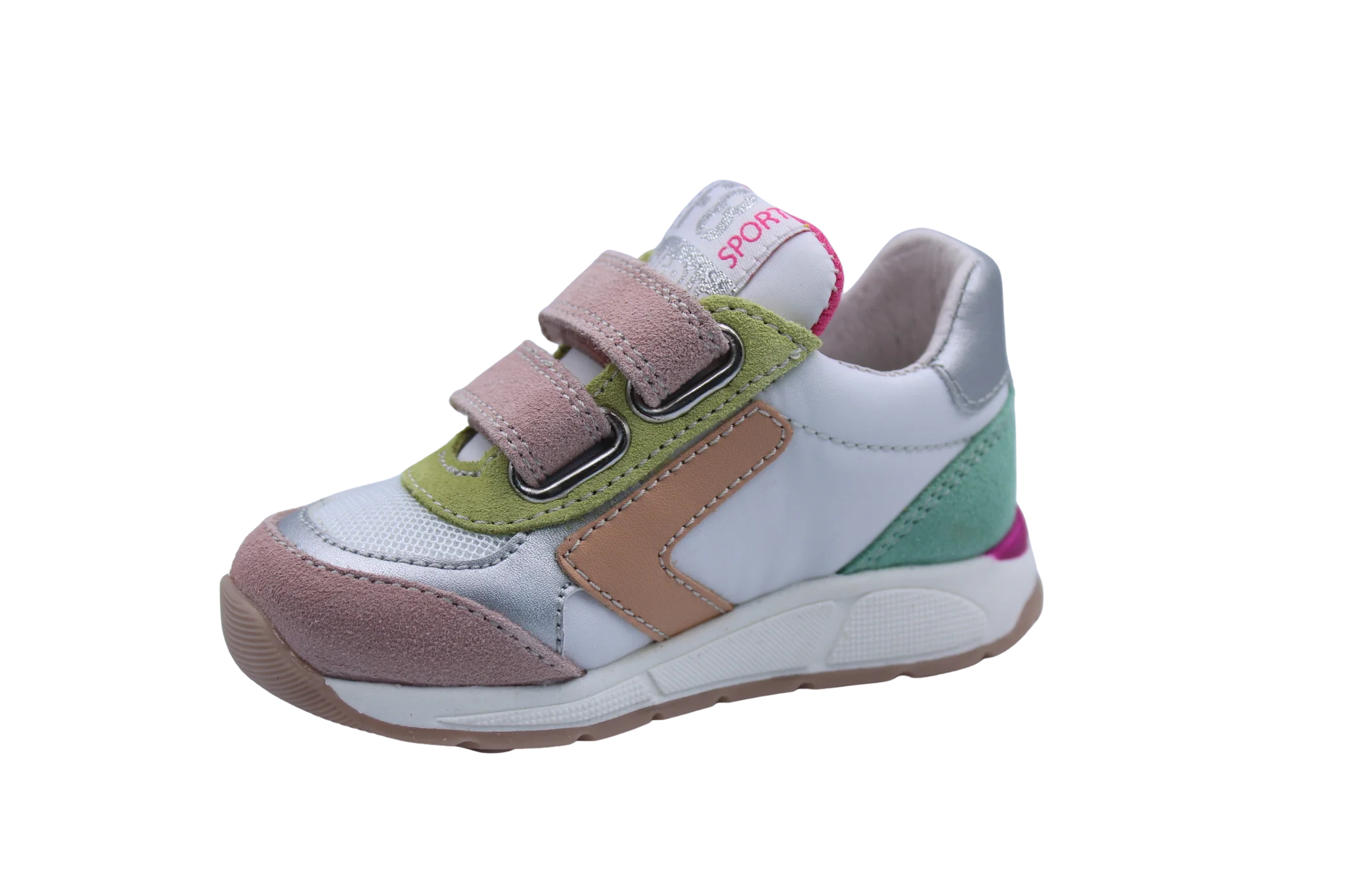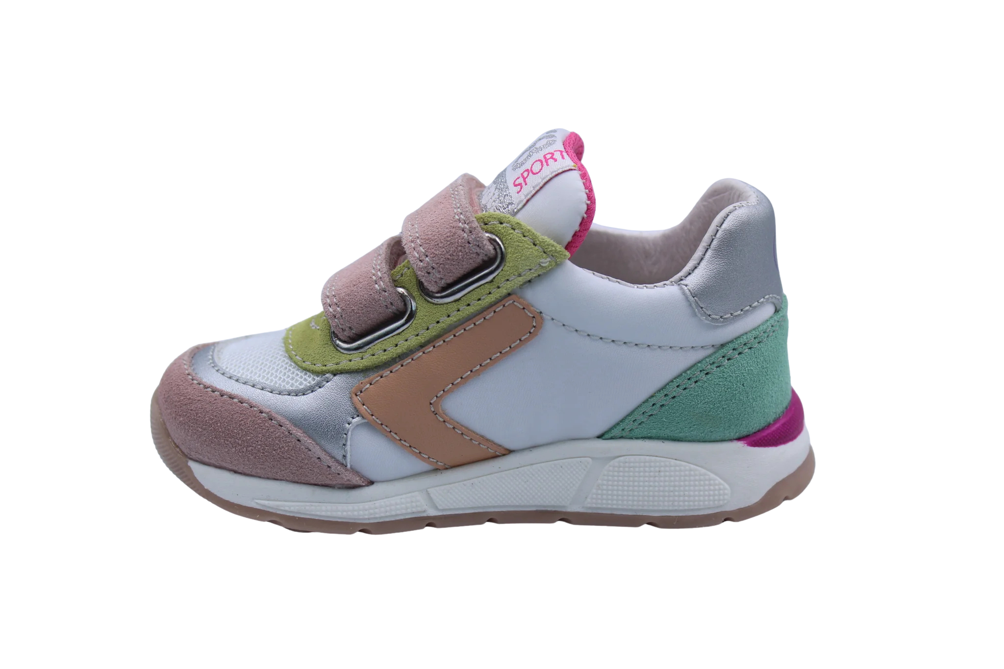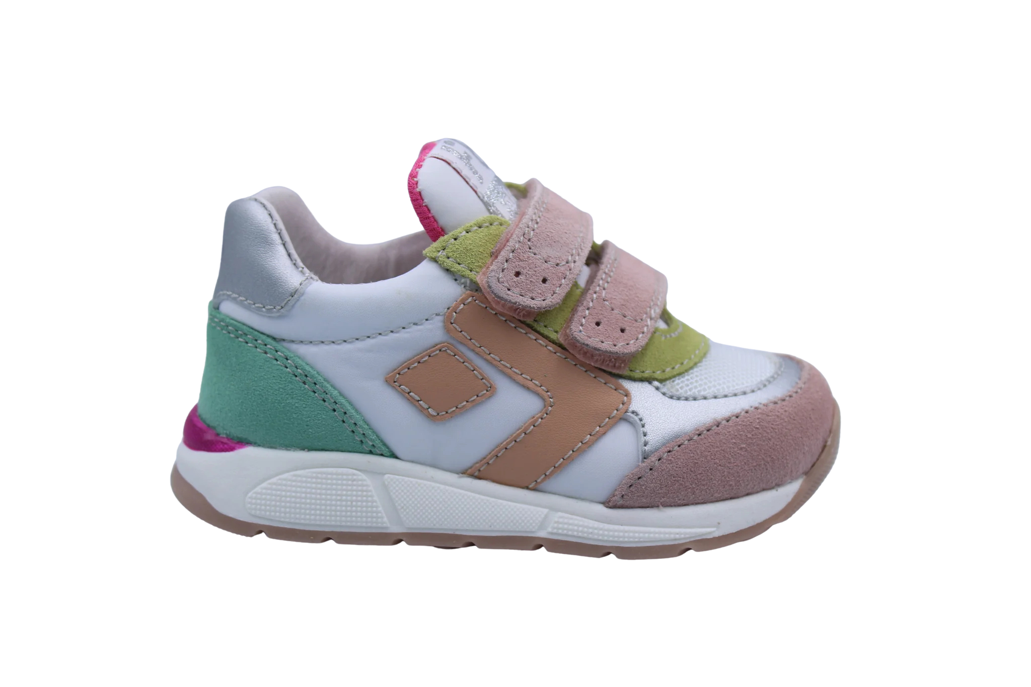 Een geweldig eerste runnertje in wit canvas met kleurdetails in geel, roze en groen pastel en een zilver accent. Ze zijn voorzien van een stevige hiel, soepele runnerzool en velcro sluitingen om makkelijk aan en uit te doen.