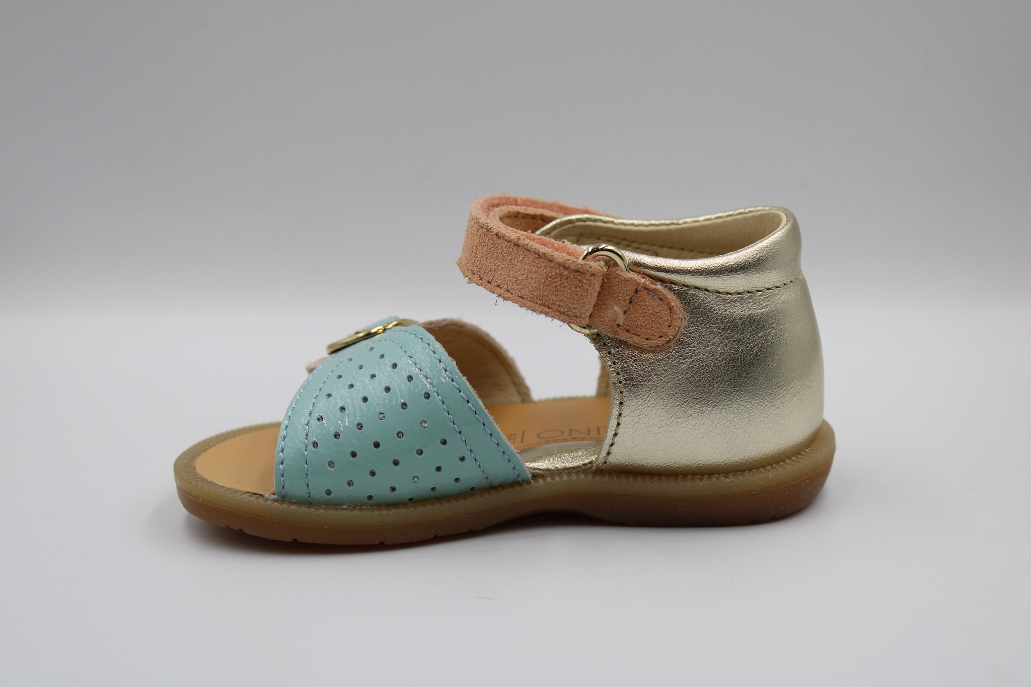 Een perfect eerste sandaaltje met stevige hiel, flexibele rubberen zool en verhoogd voetbed in lichtblauw lakleer en zalmkleurig en roze nubuck. Verder is dit sandaaltje voorzien van een gesp vooraan zodat het aan elk voetje aanpast en een velcro sluiting rond de enkel om makkelijk aan en uit te doen.