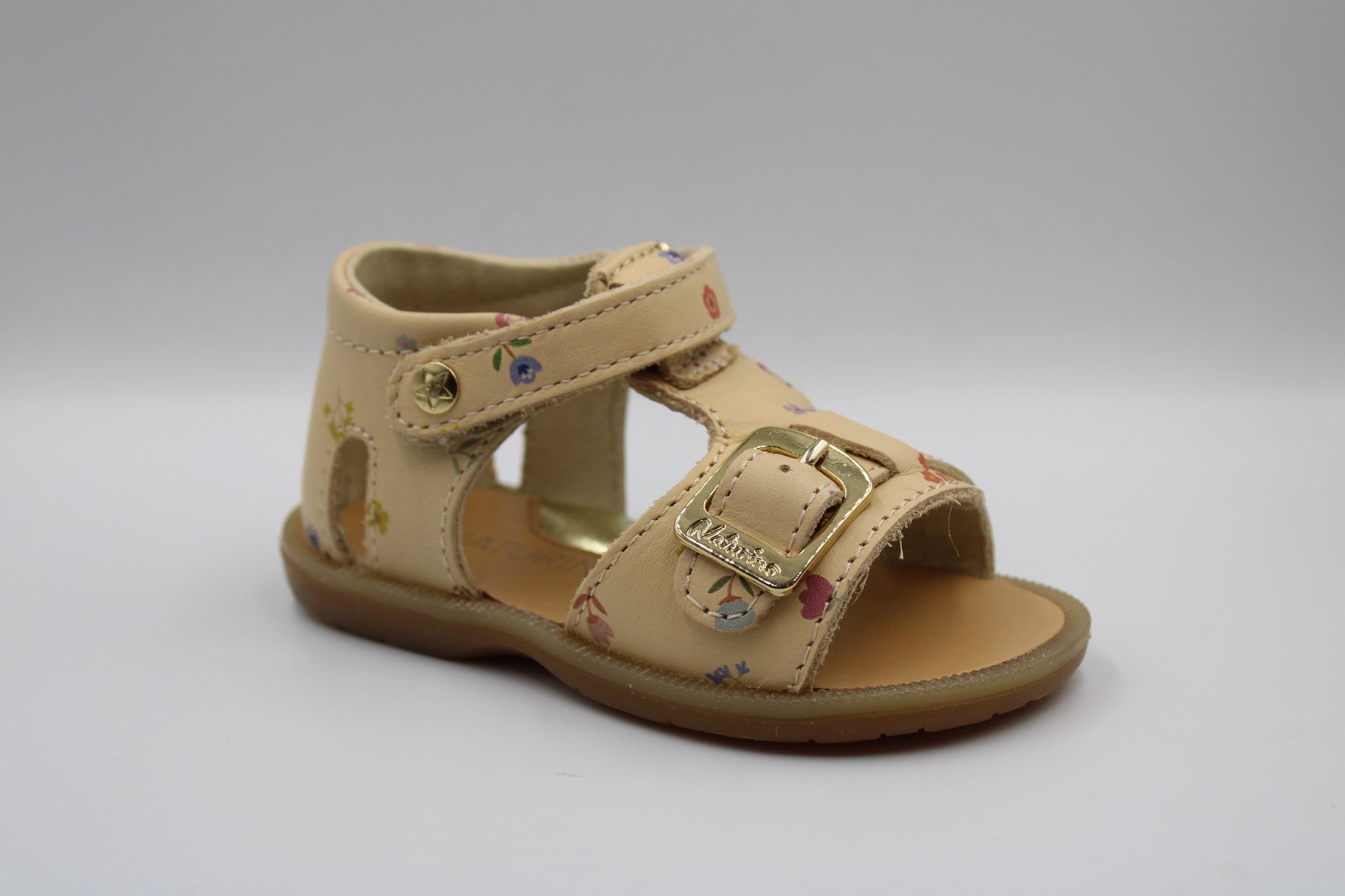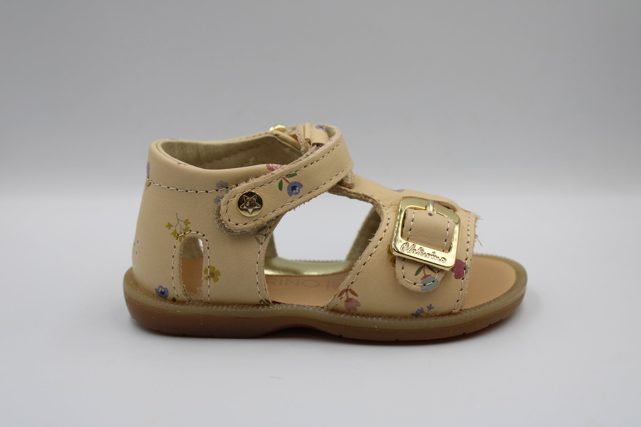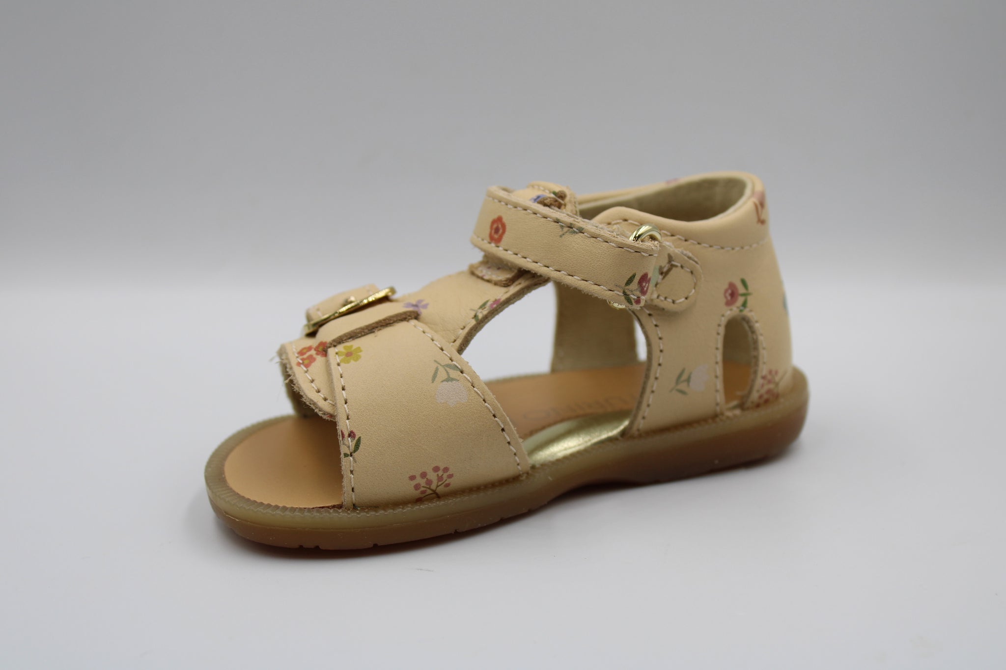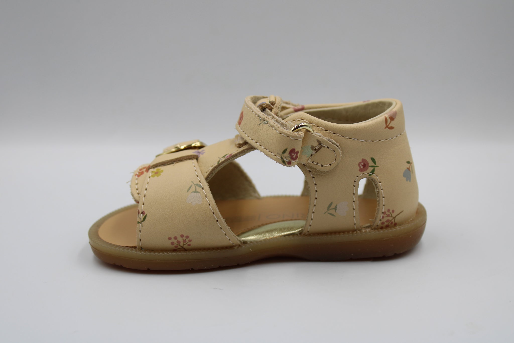 Een perfect eerste sandaaltje met stevige hiel, flexibele rubberen zool en verhoogd voetbed in vanillekleurig leer met bloemetjesprint. Verder is dit sandaaltje voorzien van een gesp vooraan zodat het aan elk voetje aanpast en een velcro sluiting rond de enkel om makkelijk aan en uit te doen.