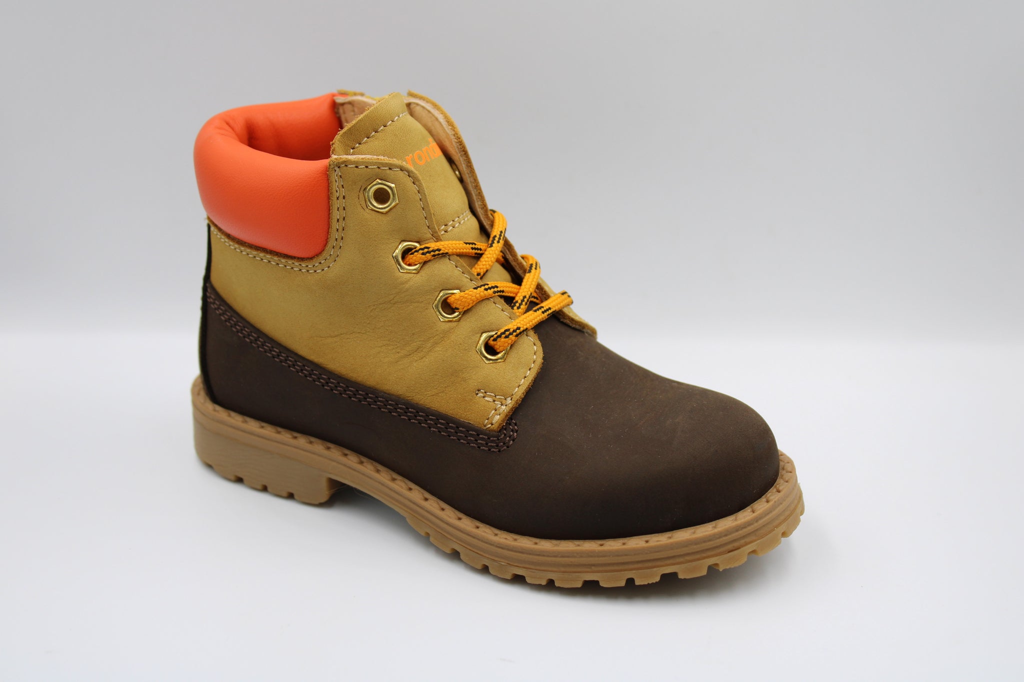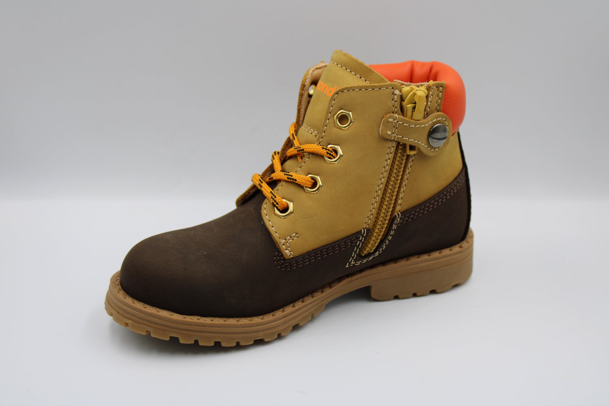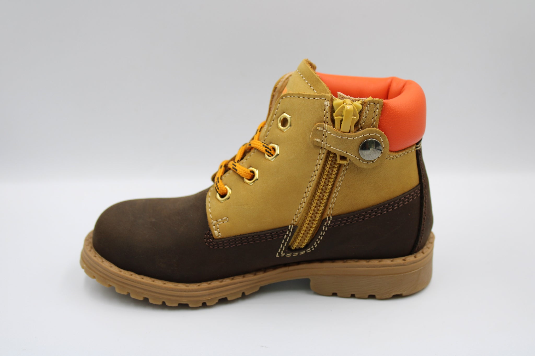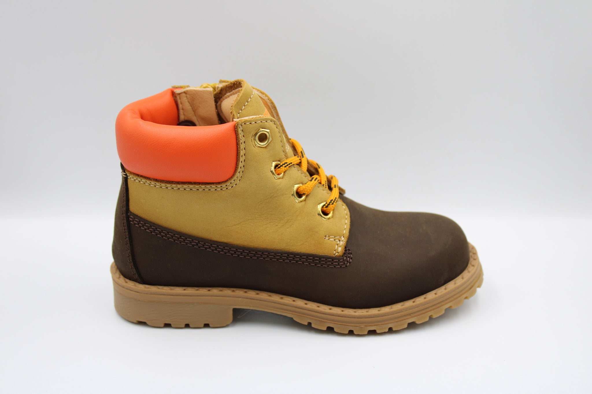Een stevige bottine in donkerbruin en camel nubuck met oranje lederen accent en oranje veters. Ze zijn voorzien van een stevige maar soepele rubberen zool, rits opzij om makkelijk aan en uit te doen en verhoogd lederen voetbed.