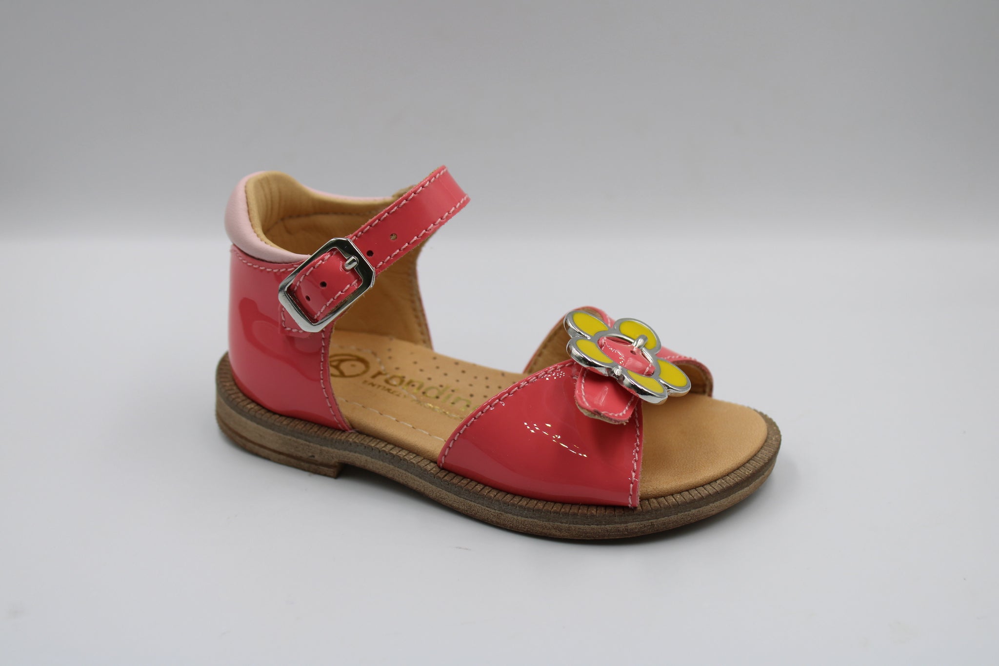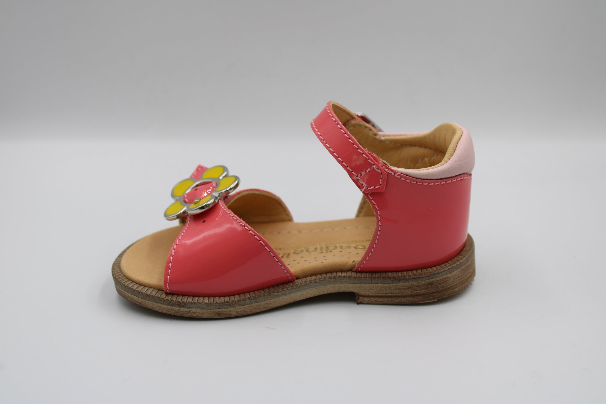 Een perfect eerste sandaaltje in roze lakleer met geel bloemetje vooraan die ook een gesp is. Ze zijn voorzien van een rubberen zool met verhoogd voetbed en stevige hiel voor extra steun en verstelbaar vooraan zodat ze aanpasbaar zijn aan elk voetje.